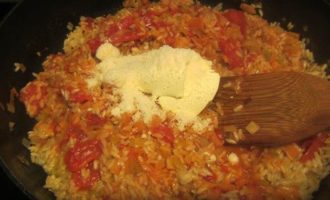 • Добавляем луково-помидорную смесь в рис. Также добавляем сливочное масло и тертый пармезан. Все перемешиваем.