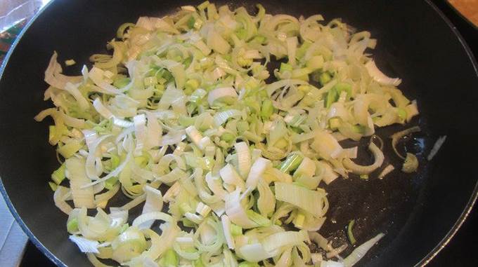 • Разогреваем оставшуюся 1 ст.л. масла. Лук-порей режем тонкими колечками, добавляем в сковороду и готовим на среднем или небольшом огне минут 10. Следим, чтобы не пригорел.