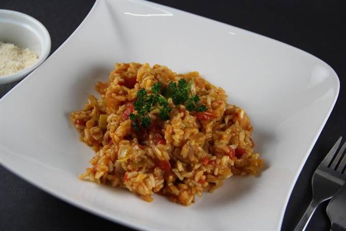 • Добавляем луково-помидорную смесь в рис. Также добавляем сливочное масло и тертый пармезан. Все перемешиваем.