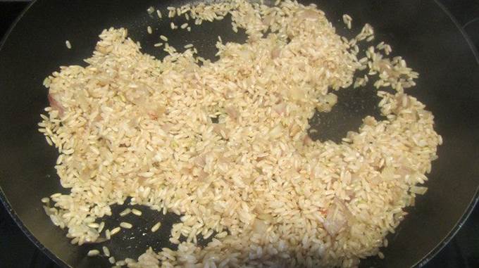 • Добавляем рис и готовим, помешивая, еще минут 5.