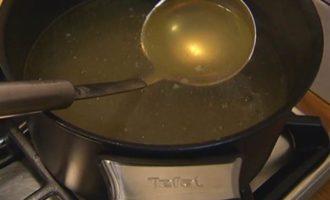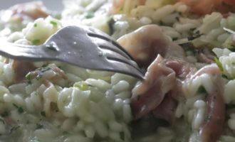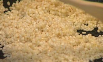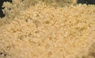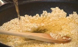 Постоянно помешивая, половник за половником добавлять бульон, давая рису впитать каждую порцию жидкости. Готовить ризотто около 20 минут, пока рис не станет сливочно-крахмальным.