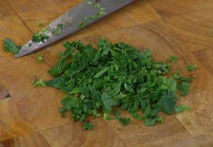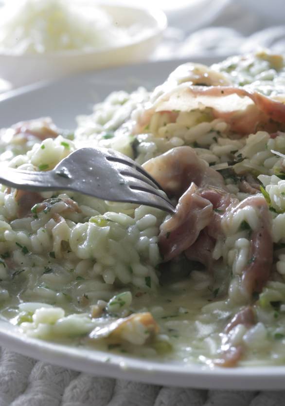 Добавить в ризотто мяту, оставшееся сливочное масло и пармезан, все перемешать. Оставшуюся ветчину нарезать и украсить ею ризотто в тарелках.