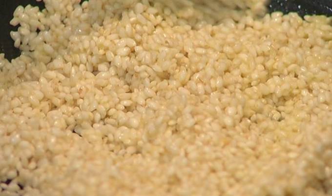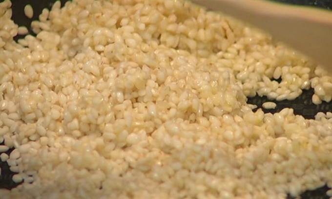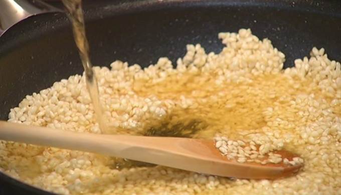 Постоянно помешивая, половник за половником добавлять бульон, давая рису впитать каждую порцию жидкости. Готовить ризотто около 20 минут, пока рис не станет сливочно-крахмальным.