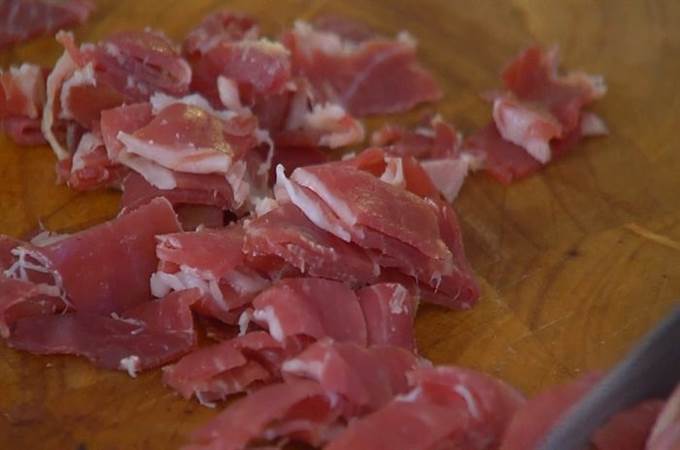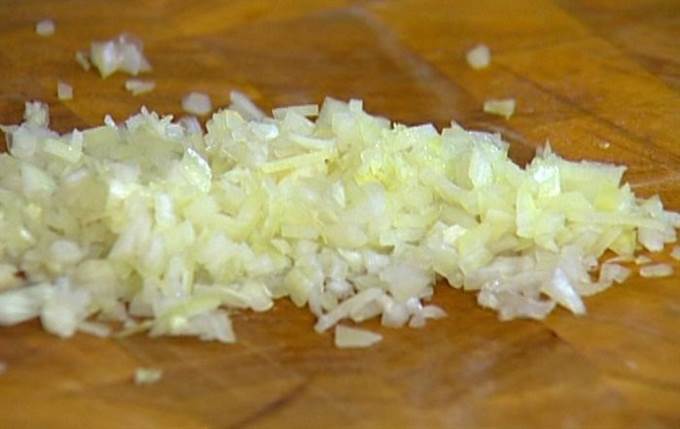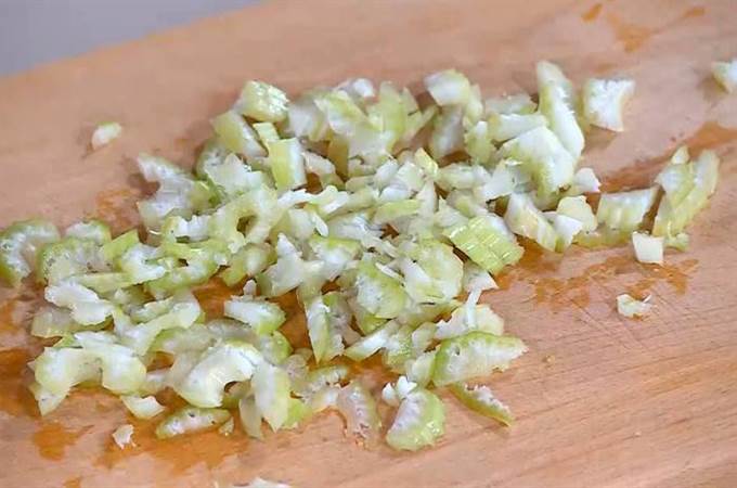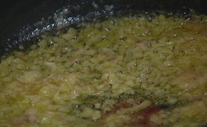 Половину сливочного масла растопить в глубокой сковороде с толстым дном и обжарить лук и сельдерей до прозрачности, затем добавить ветчину и все немного прогреть.