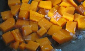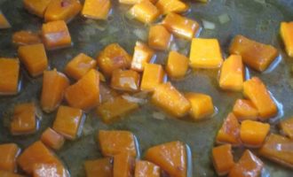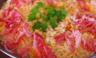 Отварить рис согласно инструкции на упаковке и выложить в сковороду с тыквой. Добавить пармезан, петрушку, хорошо перемешать. Сверху выложить бекон и подавать.
