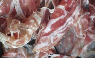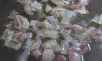 Бекон обжарить до золотистого цвета на сухой сковороде с антипригарным покрытием.