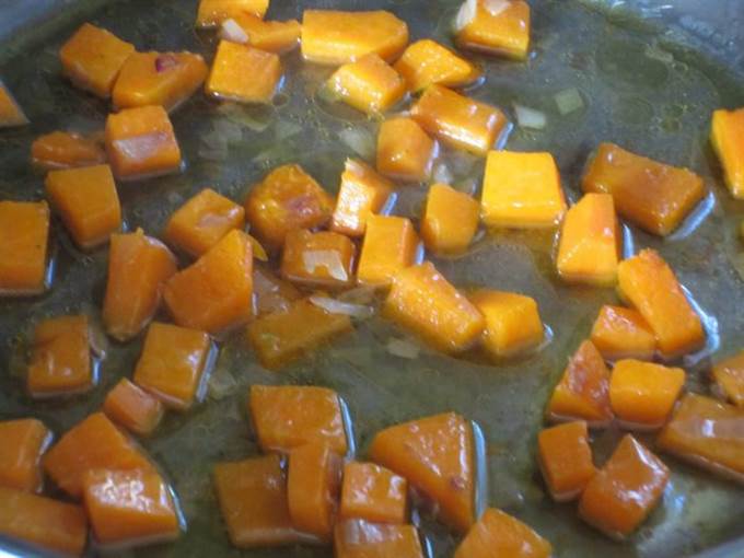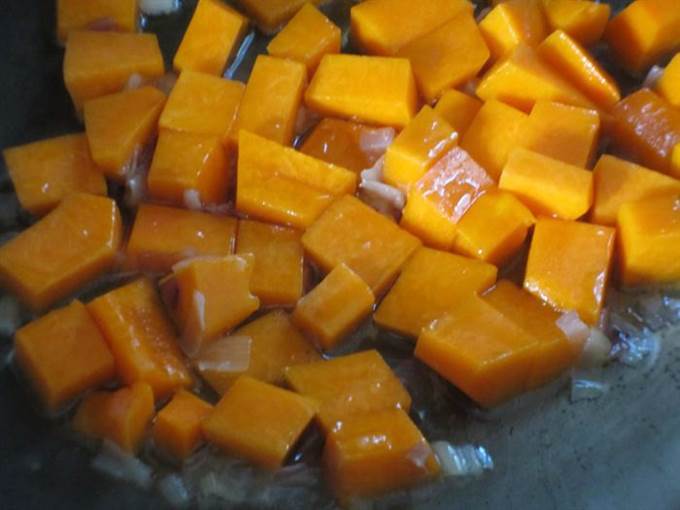 Отварить рис согласно инструкции на упаковке и выложить в сковороду с тыквой. Добавить пармезан, петрушку, хорошо перемешать. Сверху выложить бекон и подавать.