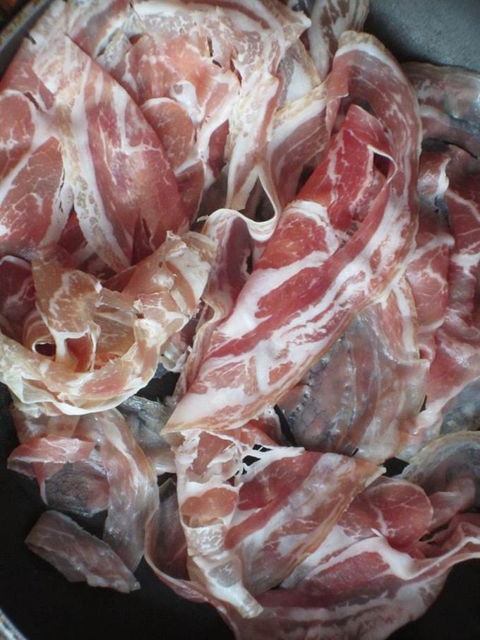 Бекон обжарить до золотистого цвета на сухой сковороде с антипригарным покрытием.
