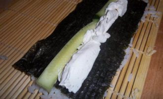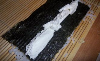 • Убедиться, что рис хорошо утрамбован. Аккуратно взять за край и быстро перевернуть, чтобы рис оказался снизу. На середину нори выложить сыр «Филадельфия» (или любой другой сливочный сыр).