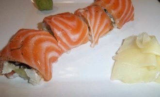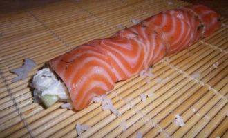 • С помощью циновки свернуть в рулет, прокатав по столу. Сверху на рис выложить ломтики свежего филе лосося, нарезанное толщиной около 5 м. Еще раз завернуть в циновку. Пододвинув ролл к краю циновки, выровнять его края с помощью пальцев. Плотно прижать циновку, чтобы ролл не распадался.