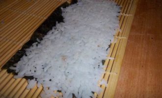 • На край циновки положить лист нори и влажными руками выложить суши-рис.