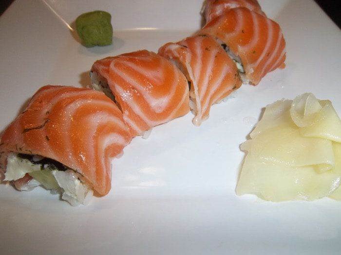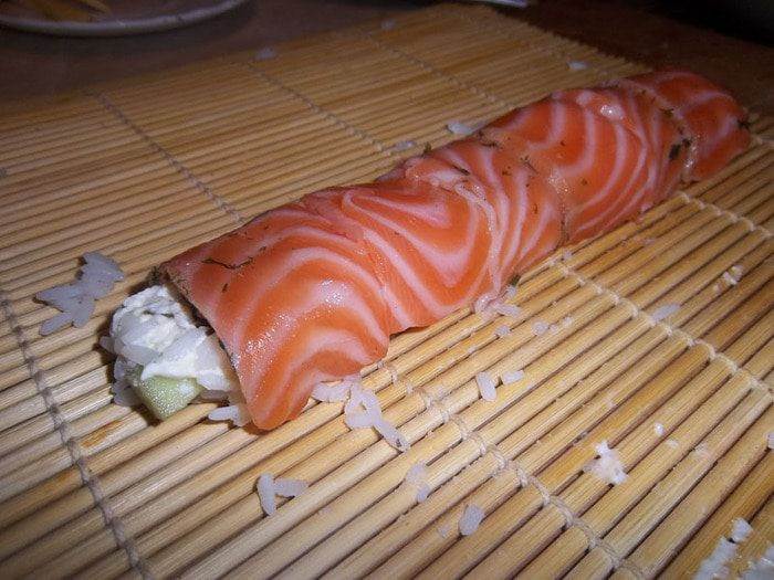 • С помощью циновки свернуть в рулет, прокатав по столу. Сверху на рис выложить ломтики свежего филе лосося, нарезанное толщиной около 5 м. Еще раз завернуть в циновку. Пододвинув ролл к краю циновки, выровнять его края с помощью пальцев. Плотно прижать циновку, чтобы ролл не распадался.