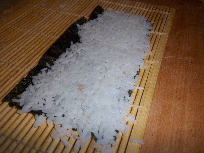 • На край циновки положить лист нори и влажными руками выложить суши-рис.