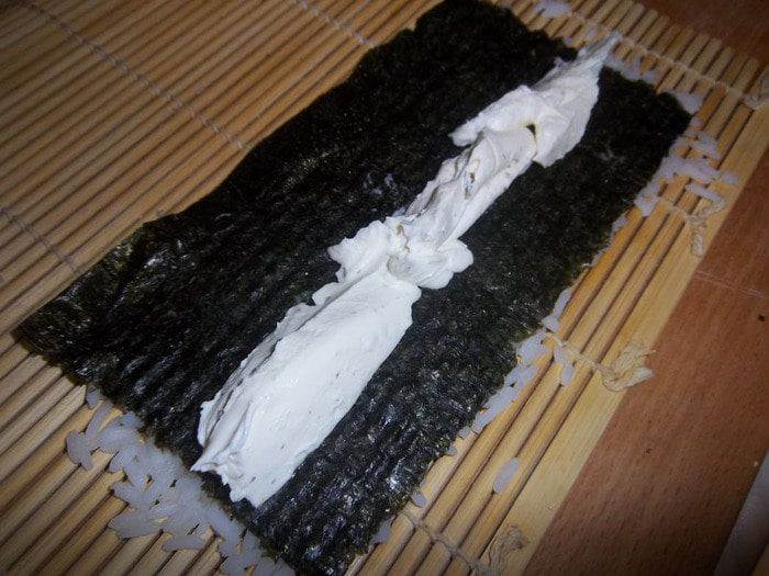 • Убедиться, что рис хорошо утрамбован. Аккуратно взять за край и быстро перевернуть, чтобы рис оказался снизу. На середину нори выложить сыр «Филадельфия» (или любой другой сливочный сыр).