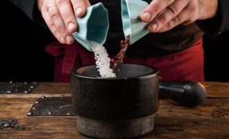 Духовку предварительно разогреть до 220°С. Мясо вымыть и просушить бумажным полотенцем. Перец и соль растереть в ступке.