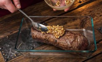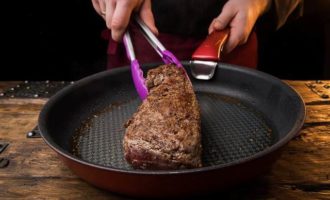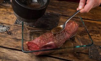 На хорошо разогретой сковороде обжарить мясо со всех сторон до золотистой корочки. Выложить на блюдо и дать мясу «отдохнуть» 5 — 10 минут.