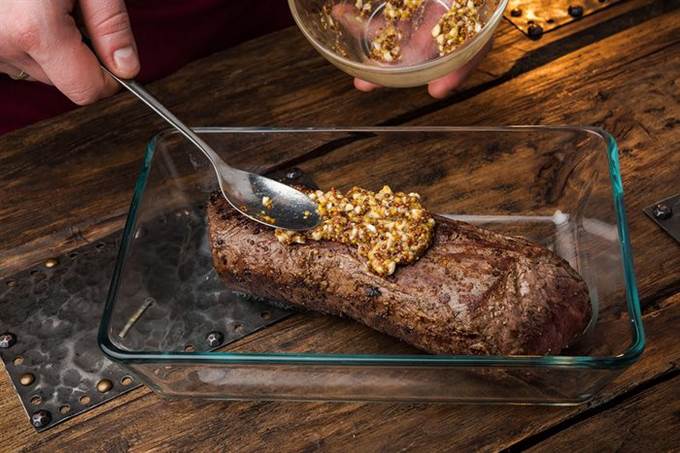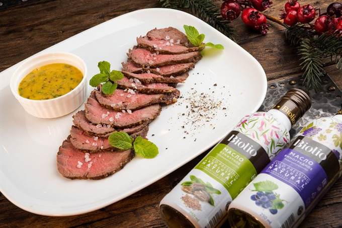 Присыпать ростбиф оставшейся мятой и подавать с горчичным соусом.