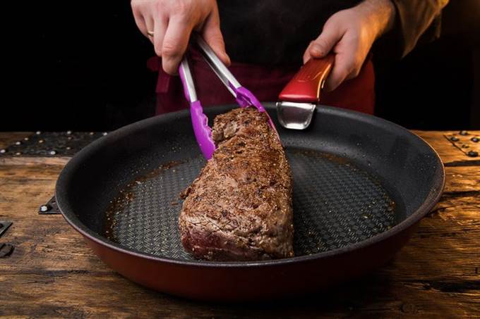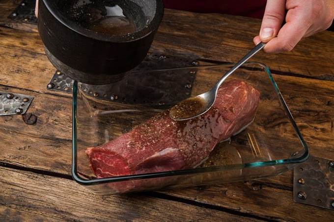 На хорошо разогретой сковороде обжарить мясо со всех сторон до золотистой корочки. Выложить на блюдо и дать мясу «отдохнуть» 5 — 10 минут.