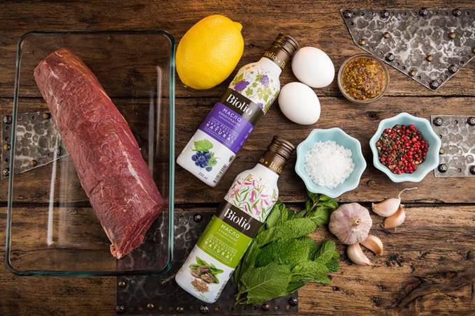 Всю мяту нарезать. Из половинки лимона выжать сок. Приготовить соус: желтки перемешать с 1 ст. ложкой горчицы и лимонным соком, затем тонкой струйкой влить 100 мл кунжутного масла Biolio. Все взбить. В загустевший соус добавить большую часть мяты.