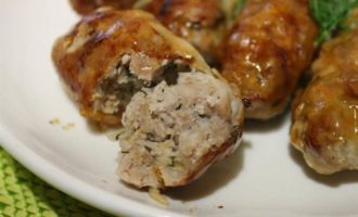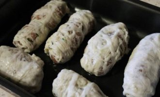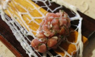 На рабочую поверхность выложить сетку, разровнять ее. Затем берем немного фарша и формируем продолговатую котлету, кладем ее на край сетки и сворачиваем конвертиком.