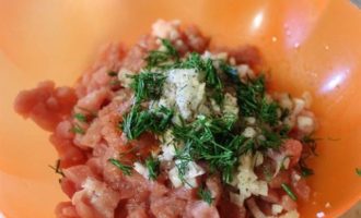 К мясу добавить лук, чеснок и специи. Хорошо перемешать.