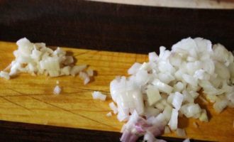 Чеснок и лук нарезать мелкими кубиками.