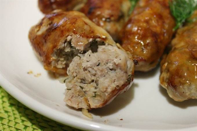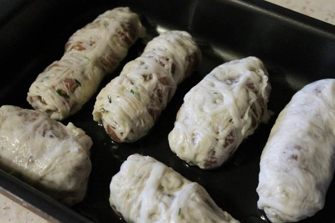 На рабочую поверхность выложить сетку, разровнять ее. Затем берем немного фарша и формируем продолговатую котлету, кладем ее на край сетки и сворачиваем конвертиком.