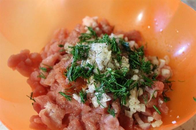 К мясу добавить лук, чеснок и специи. Хорошо перемешать.