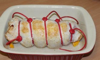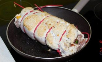 Свернуть рулетом, стянуть кулинарными жгутиками или нитью. Обжарить рулет со всех сторон на сковороде.