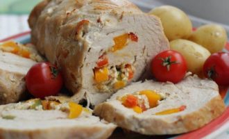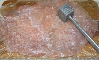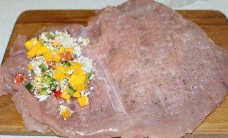 Грудку индейки накрыть пленкой и отбить в виде тонкого и широкого листа, чтобы можно было свернуть в рулет. Посолить, поперчить с двух сторон.