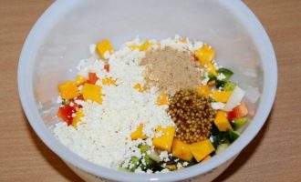 К овощам добавить все остальные ингредиенты, посолить, поперчить, можно добавить зелень, капнуть немного оливкового масла.