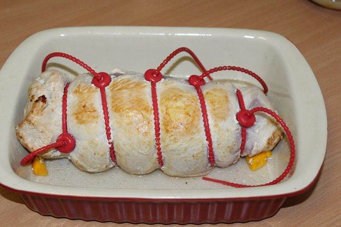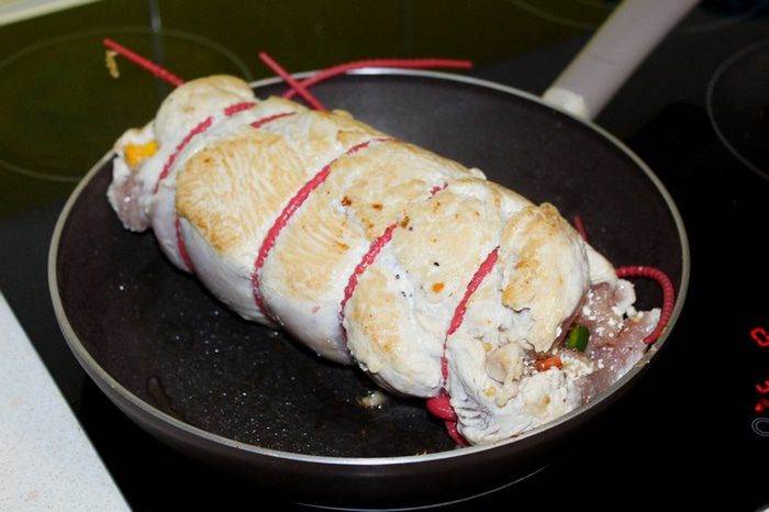 Свернуть рулетом, стянуть кулинарными жгутиками или нитью. Обжарить рулет со всех сторон на сковороде.