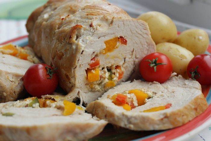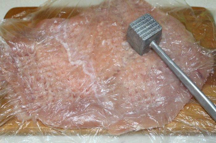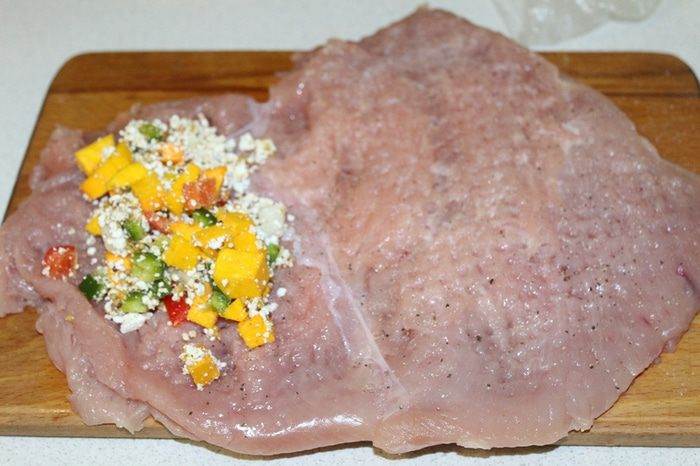 Грудку индейки накрыть пленкой и отбить в виде тонкого и широкого листа, чтобы можно было свернуть в рулет. Посолить, поперчить с двух сторон.