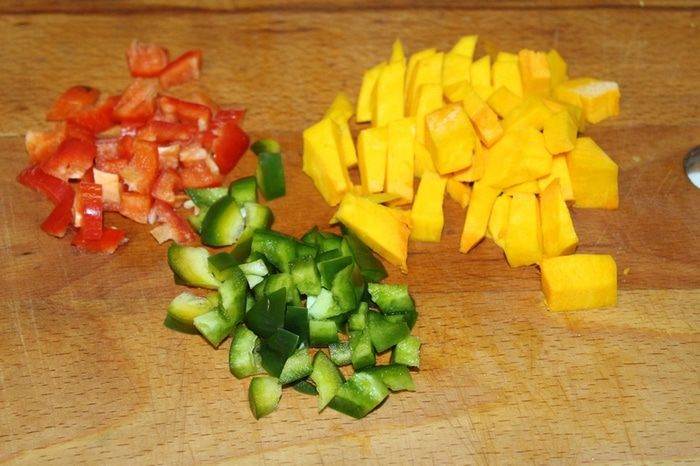 Болгарский перец (у меня половинки двух разноцветных перцев), тыкву нарезать кубиками.