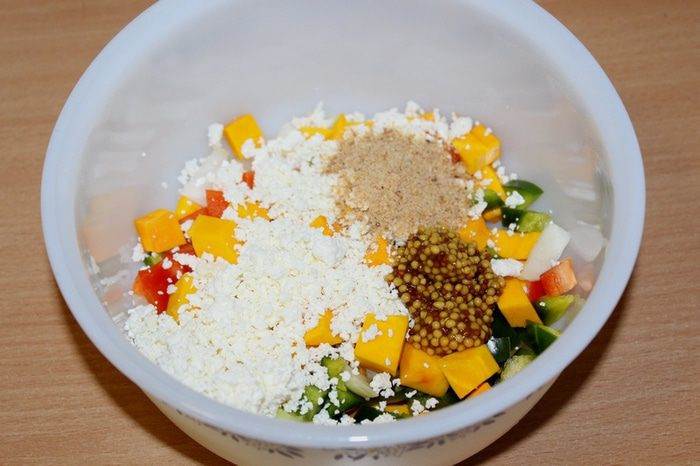 К овощам добавить все остальные ингредиенты, посолить, поперчить, можно добавить зелень, капнуть немного оливкового масла.