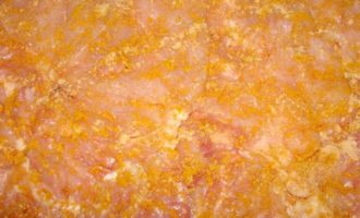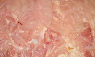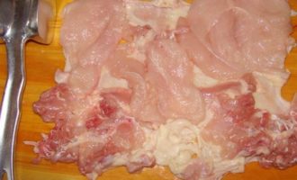Мясо курицы осторожнее, чтобы как можно меньше повредить кожу, отделить от костей. Отбить.