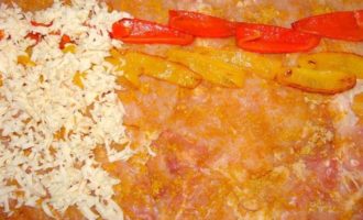 Выложить перец, сверху слой натертого сыра (у меня колбасный).