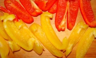 Перец очистить, порезать каждый на 8 частей.
