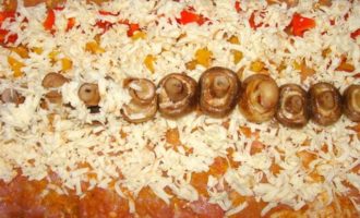 Выложить шампиньоны. присыпать их остатками сыра.