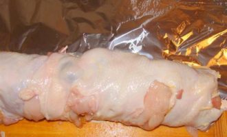 Свернуть рулет. Обернуть его фольгой, поставить запекаться на 1.5 часа при 170°С. Через 30 минут, поставить поднос с водой вниз. Вынуть рулет, полностью остудить.