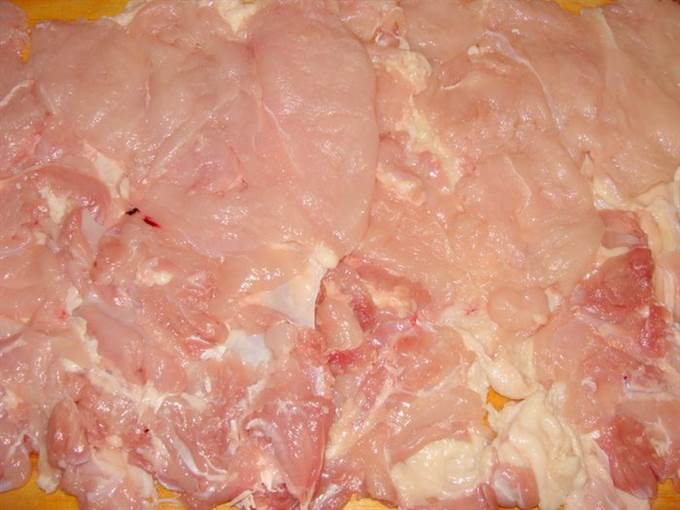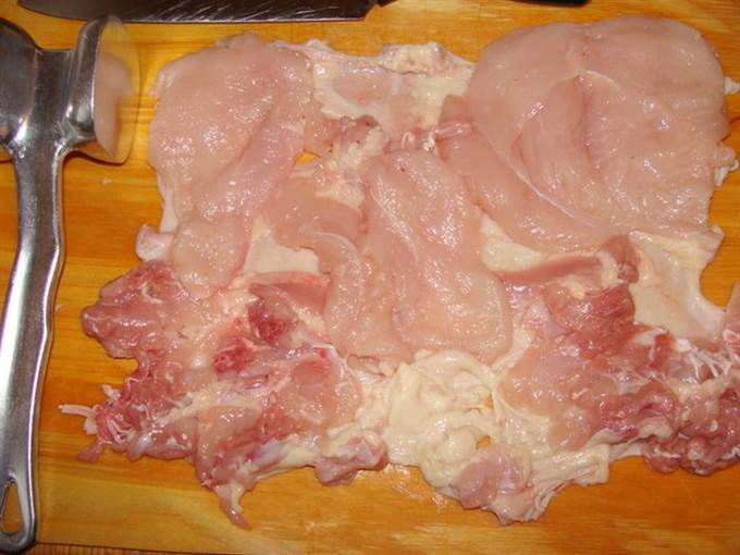 Мясо курицы осторожнее, чтобы как можно меньше повредить кожу, отделить от костей. Отбить.
