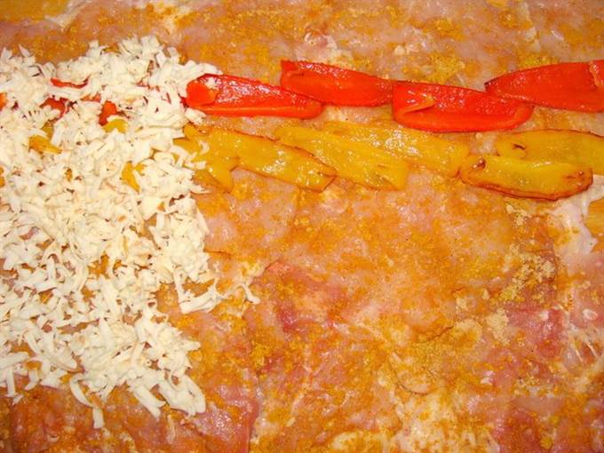 Выложить перец, сверху слой натертого сыра (у меня колбасный).