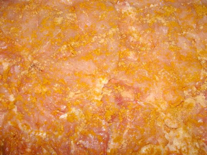 Посолить, посыпать карри и имбирем.