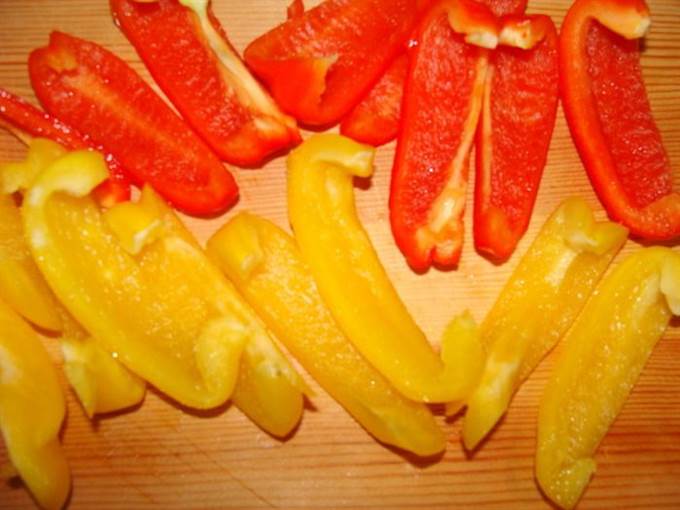 Перец очистить, порезать каждый на 8 частей.