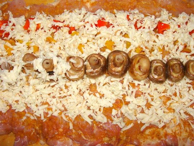 Выложить шампиньоны. присыпать их остатками сыра.