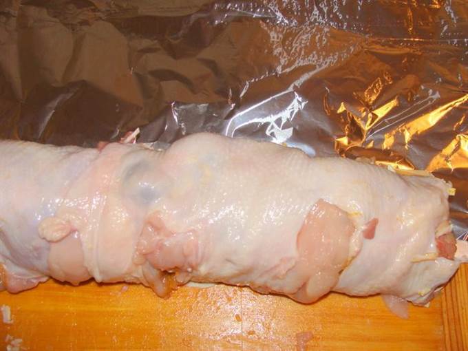 Свернуть рулет. Обернуть его фольгой, поставить запекаться на 1.5 часа при 170°С. Через 30 минут, поставить поднос с водой вниз. Вынуть рулет, полностью остудить.