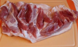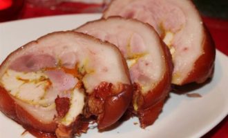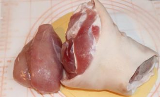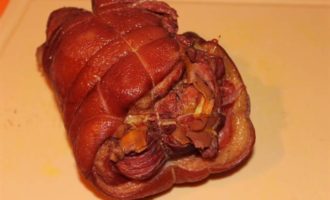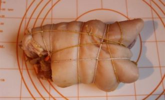 Рульку моем, зачищаем шкурку. Разрезаем и удаляем кость. Мясо слегка отбиваем. Лишнее мясо можно срезать, чтобы легче было свернуть рульку. Солим, перчим и натираем выдавленным чесноком.