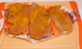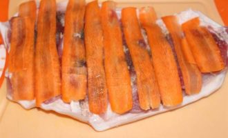 Нарезаем тонко сырую морковь, при помощи овощечистки. Выкладываем полоски на рульку.