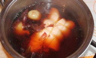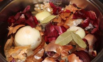 Готовим маринад. В кастрюльку наливаем 2 литра воды. Добавляем луковую шелуху, лавровый лист, 2 луковицы очищенные, перец горошком. Доводим до кипения и кипятим 10 минут.