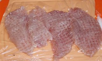 Куриную грудку нарезаем на тонкие пласты. Отбиваем. Я накрываю для этого его пленкой. И посыпаем обильно куркумой (или карри).